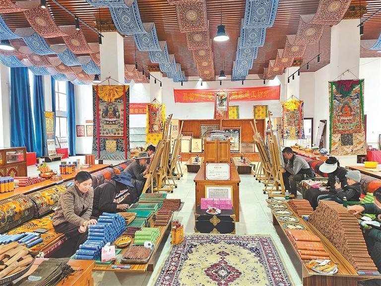 黨建引領,產業提質。在當地黨委、政府的大力扶持下,政策引導、資金注入、平臺搭建等利好舉措相繼落地。短短4年間,貢覺縣桑珠榮村一處不起眼的廠房華麗轉身,變為桑珠榮村民族手工業孵化基地,堤無瑪藝術傳承合作社也應運而生,成為該村的集體經濟組織。