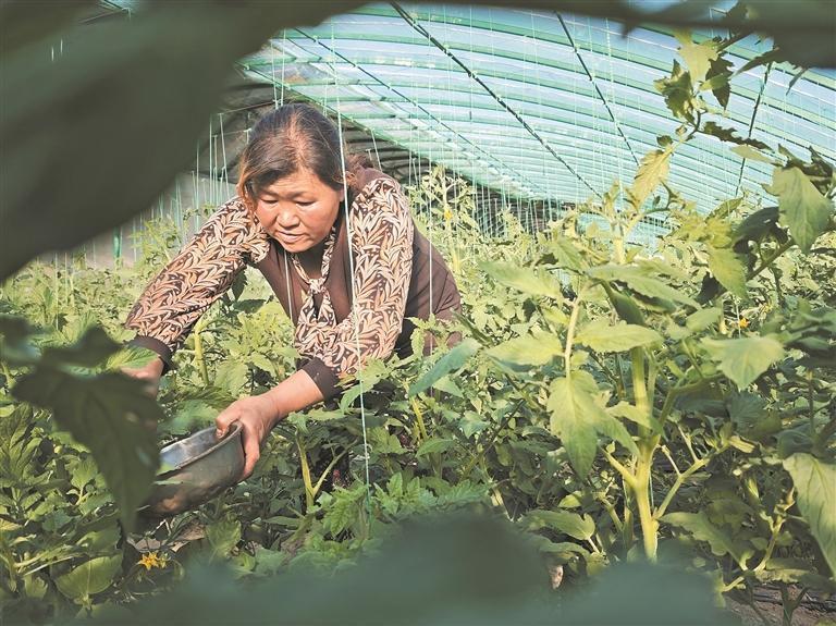 農戶給西紅柿授粉。