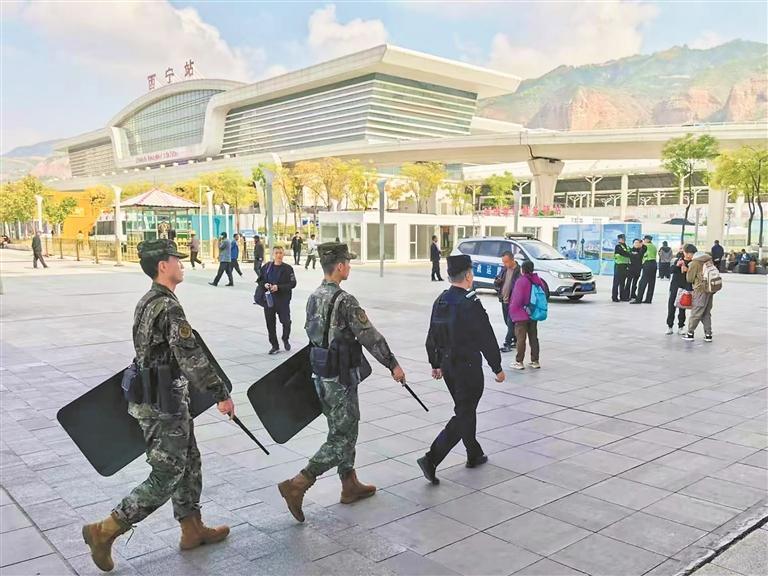 巡邏人員在西寧站前廣場執行安保任務?;疖囌窘值拦﹫D