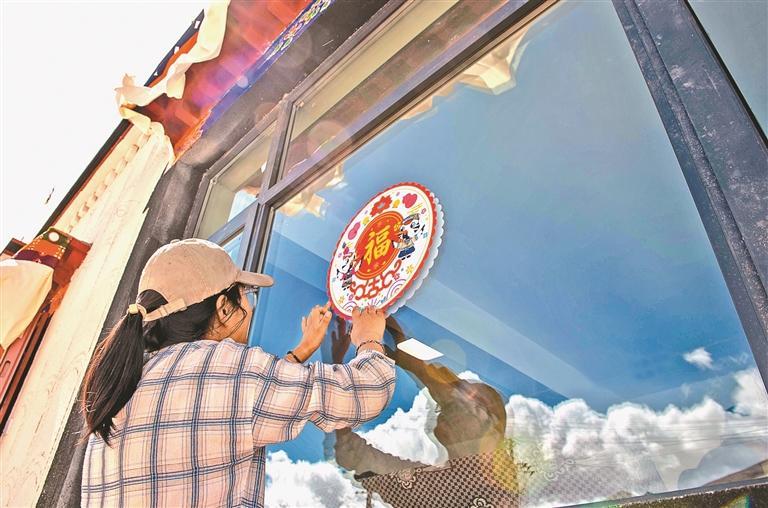 定結縣郭加鄉乃村重建點,群眾正在為新家貼福字。記者 旦增嘎瓦 攝