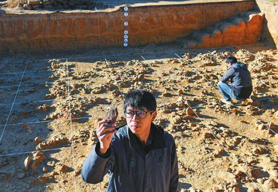 10月29日,考古隊員在清理遺址上的石器。