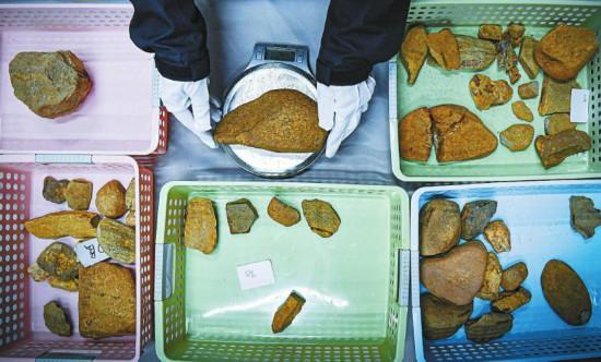 11月1日,考古人員對發(fā)掘出的每件石器進行稱重。
