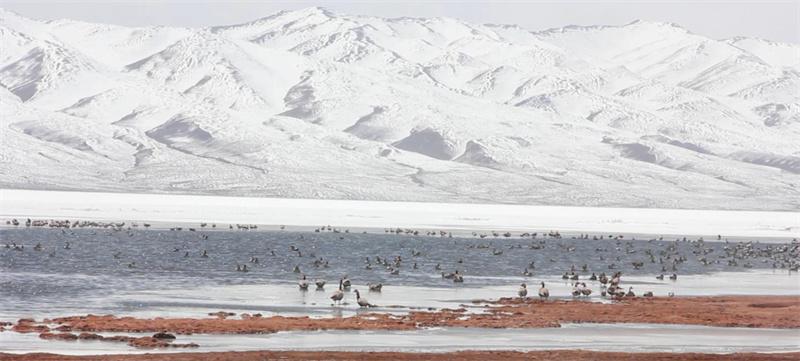 雪山與赤麻鴨同框。先宮攝