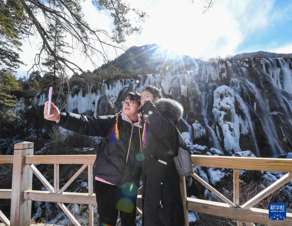 ??1月4日,游客在九寨溝風景名勝區冰瀑景觀前留影。新華社記者 王曦 攝