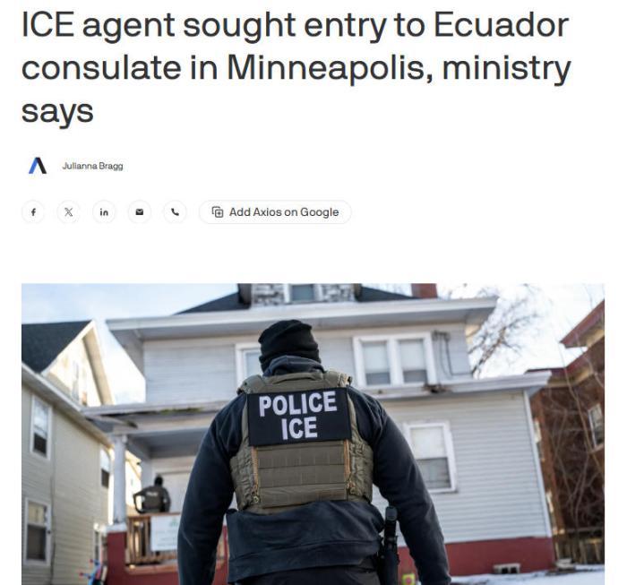 中新網(wǎng)1月28日電 綜合美媒報道,厄瓜多爾外交部稱,當(dāng)?shù)貢r間27日,一名美國移民及海關(guān)執(zhí)法局(ICE)執(zhí)法人員試圖強(qiáng)行闖入厄瓜多爾駐明尼阿波利斯領(lǐng)事館,遭到領(lǐng)事館工作人員阻止。