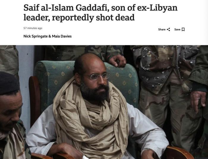 首頁 / 新聞 / 國際新聞 / 正文 外媒:卡扎菲之子賽義夫身亡 來源 : 中國新聞網 發布時間 : 2026-02-04 字體 :小 中 大 中新網2月4日電 據英國廣播公司(BBC)當地時間3日報道,已故利比亞前領導人卡扎菲之子賽義夫·伊斯蘭·卡扎菲在利比亞身亡。圖片來源:英國廣播公司(BBC)報道截圖BBC援引利比亞通訊社消息稱,賽義夫·伊斯蘭·卡扎菲的死訊3日得到其政治團隊負責人的證實。法新社稱,賽義夫·伊斯蘭·卡扎菲在其目前所居住的位于利比亞西部城市津坦的住處被實施暗殺。目前,利比亞官方尚未對事件情況作出說明。 編輯 : 才讓尖措