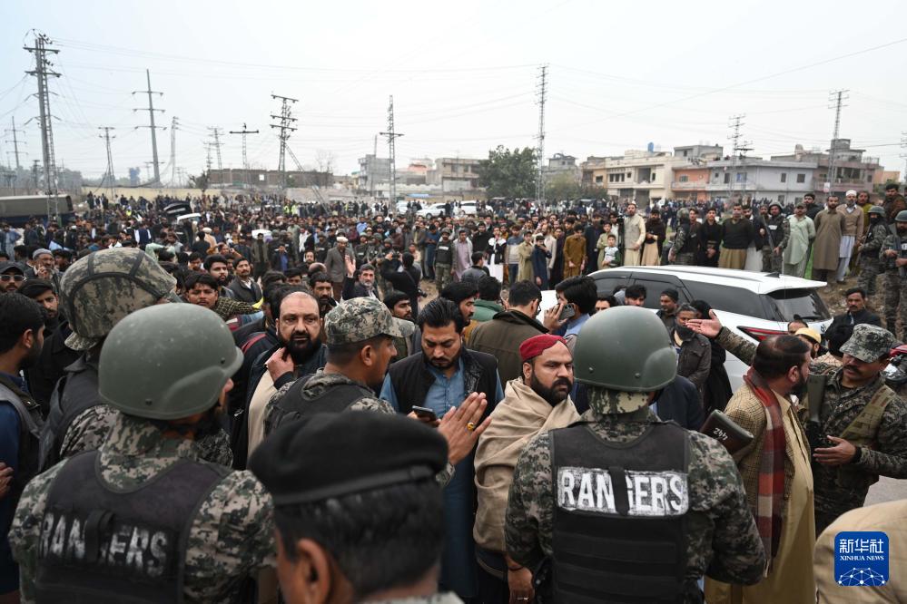2月6日,在巴基斯坦首都伊斯蘭堡,安全人員和圍觀群眾聚集在爆炸現場。新華社發 (艾哈邁德·卡邁勒攝)