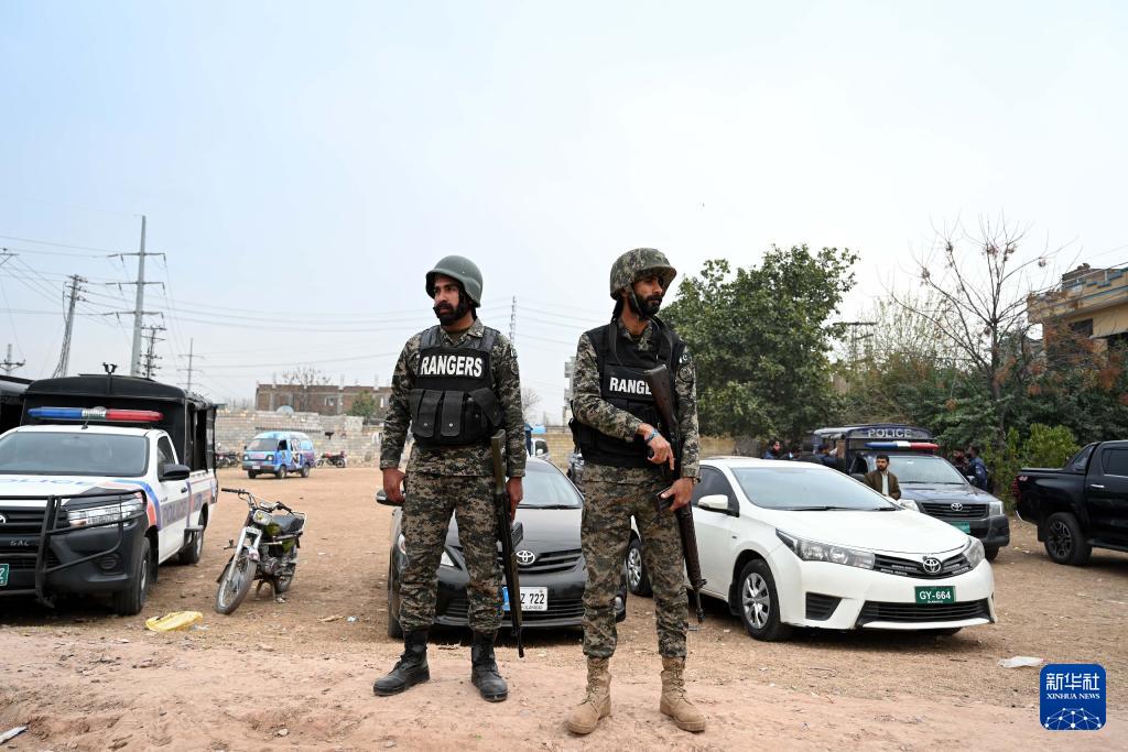 2月6日,在巴基斯坦首都伊斯蘭堡,安全人員在爆炸現場警戒。新華社發 (艾哈邁德·卡邁勒攝)