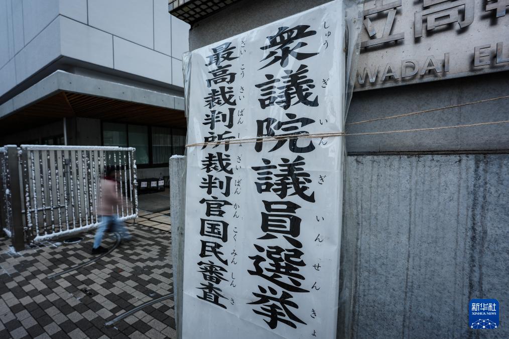 2月8日,在日本東京,工作人員在一處投票站外放置投票站標志。新華社記者 賈浩成 攝