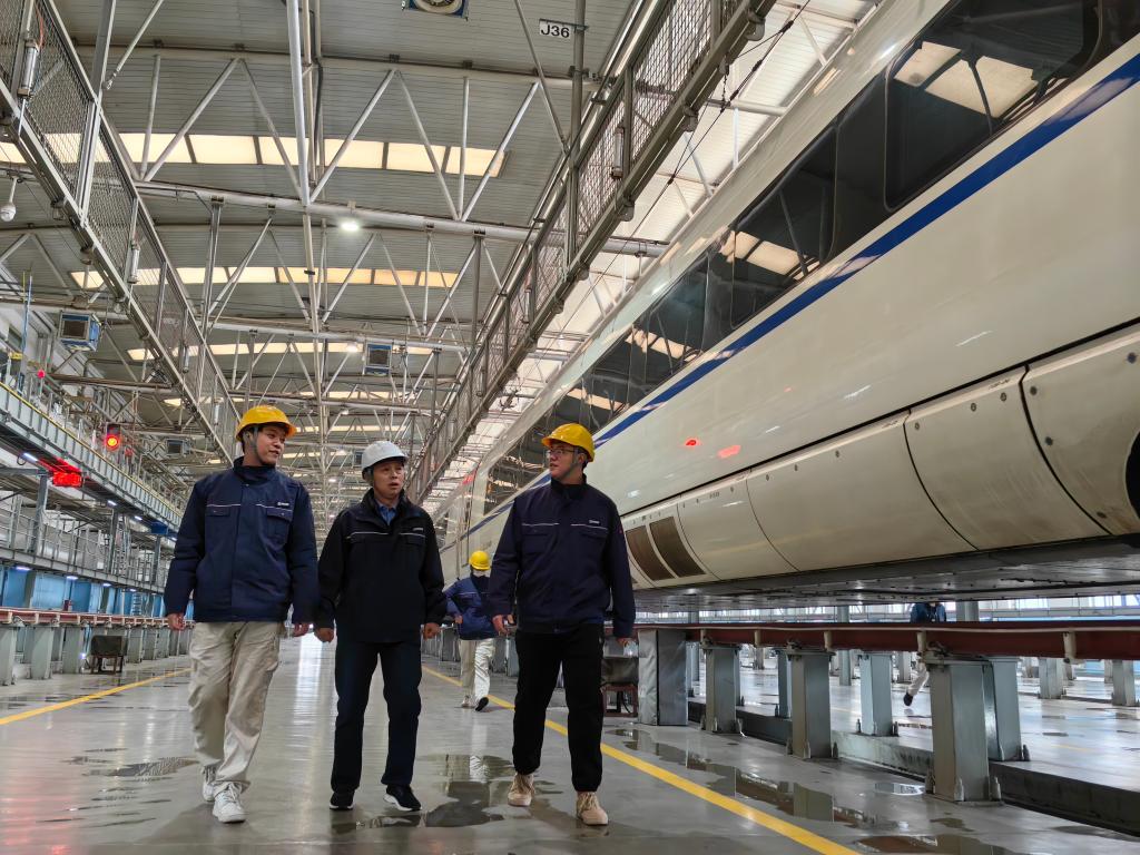 走進西安動車段動車組檢查庫,一列列長途奔波的動車緩緩駛入。身著深藍色工作服的董宏濤正在給幾名青年技工進行技術指導,耐心傳授著工作經驗。春運期間,董宏濤和同事們比平日更忙碌了。