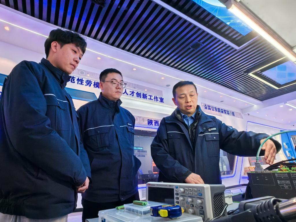 董宏濤(中間)正在給青年技工進行技術指導。新華社記者張斌 攝
