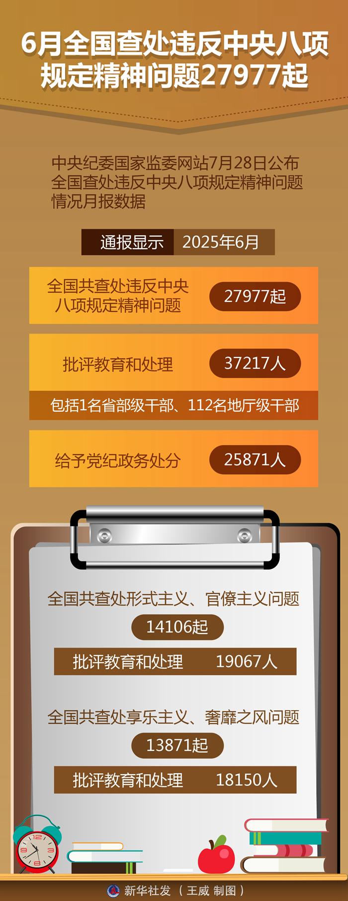 新華社北京7月28日電 中央紀委國家監委網站28日公布全國查處違反中央八項規定精神問題情況月報數據。通報顯示,今年6月,全國共查處違反中央八項規定精神問題27977起,批評教育和處理37217人(包括1名省部級干部、112名地廳級干部),給予黨紀政務處分25871人。