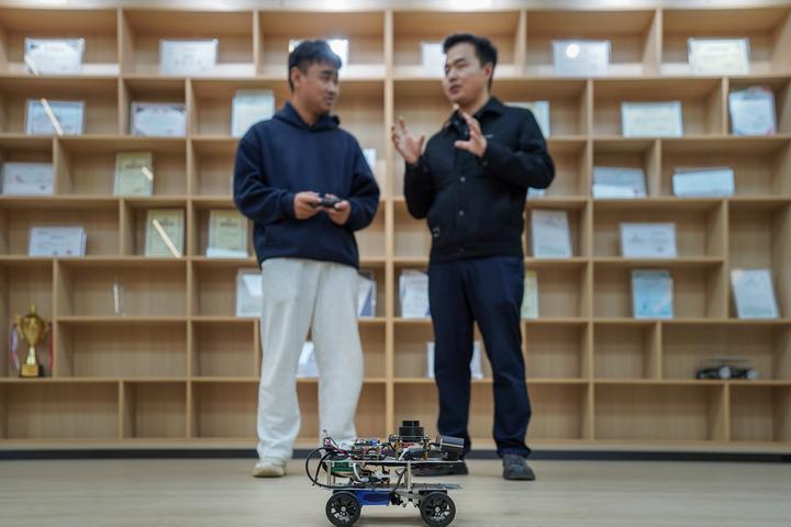 10月29日,鄭棋元(右)在云南技師學院辦公室指導學生對移動機器人進行調試。新華社記者 彭奕凱 攝