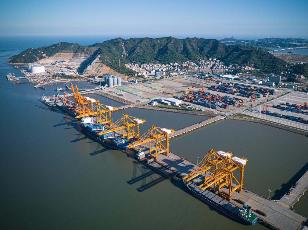 貨輪停靠在溫州港狀元岙集裝箱碼頭卸載集裝箱(無人機照片)。新華社記者江漢 攝