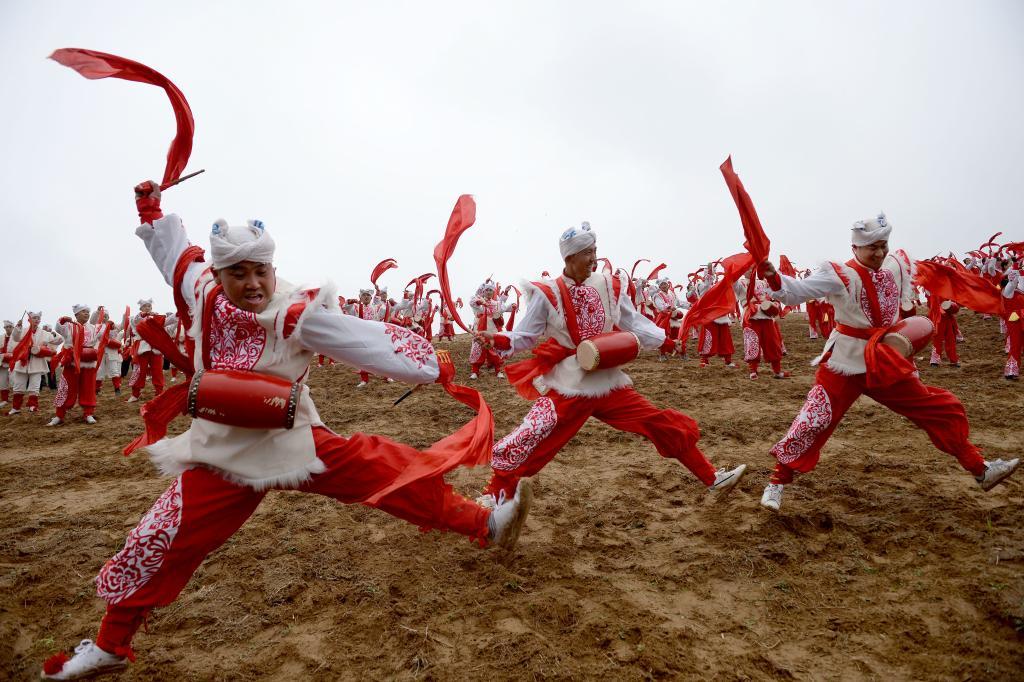 腰鼓手在陜西省延安市安塞區南溝村進行一場山地腰鼓演出。新華社記者 劉瀟 攝