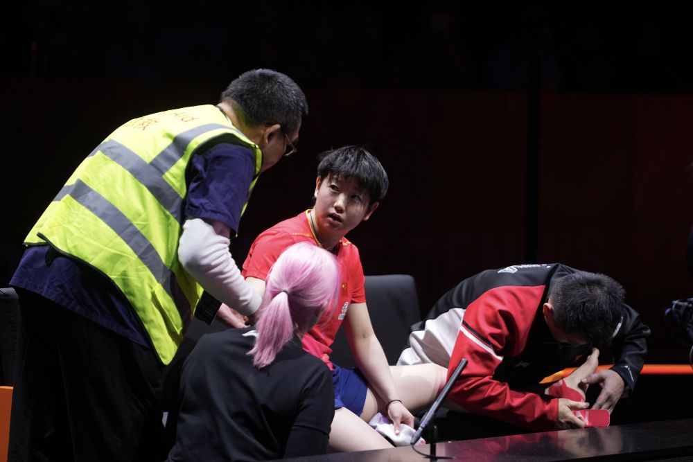 孫穎莎(中)在2025年世界乒乓球職業(yè)大聯(lián)盟(WTT)總決賽女子單打半決賽中接受治療。新華社發(fā)(呂小煒 攝)