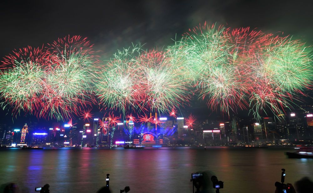 農歷正月初二晚上,香港維多利亞港上空煙花璀璨。“馬蹄鐵”“元寶”等帶有春節元素的禮花綻放,照亮夜空。