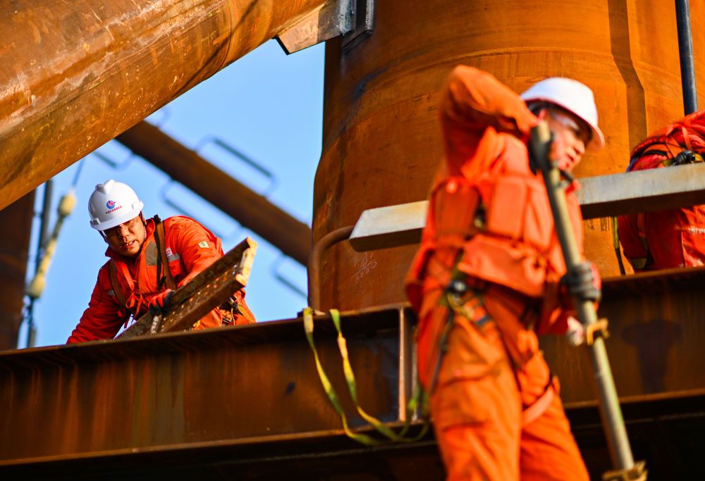 ??2026年2月13日,工人在位于渤海中部海域的渤中26-6油田開發項目(二期)作業現場施工。新華社記者 趙子碩 攝