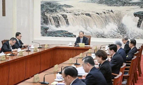 中共中央政治局委員、國務院副總理何立峰25日下午在人民大會堂會見隨德國總理默茨訪華的德國經濟代表團,雙方就深化中德經貿合作等問題交換了意見。