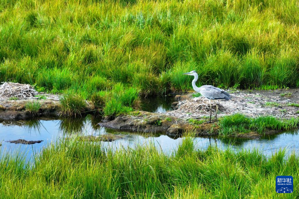 這是在尕海濕地拍攝的蒼鷺(9月4日攝,無人機照片)。新華社發(拉瑪才旦 攝)