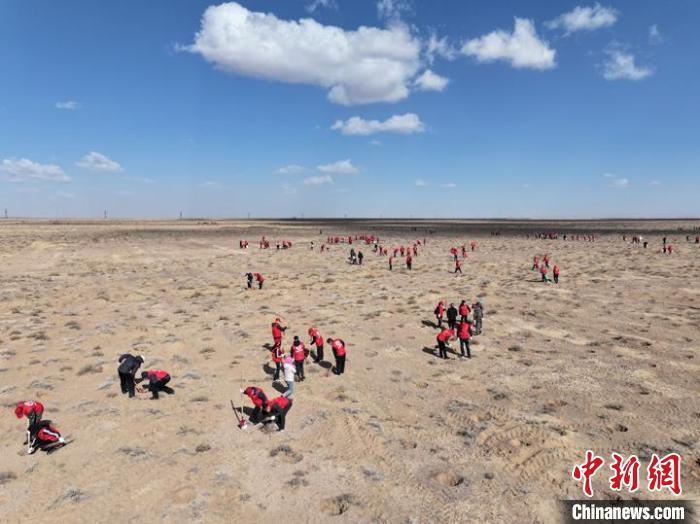 圖為壓沙植樹現(xiàn)場。武威市融媒體中心供圖