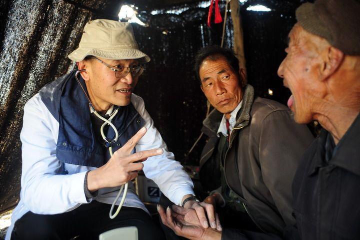 2012年10月30日,王萬青(左)在牧民帳篷內為牧民診斷病情(資料圖片)。新華社記者 張錳 攝