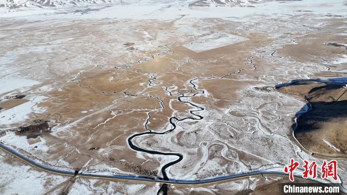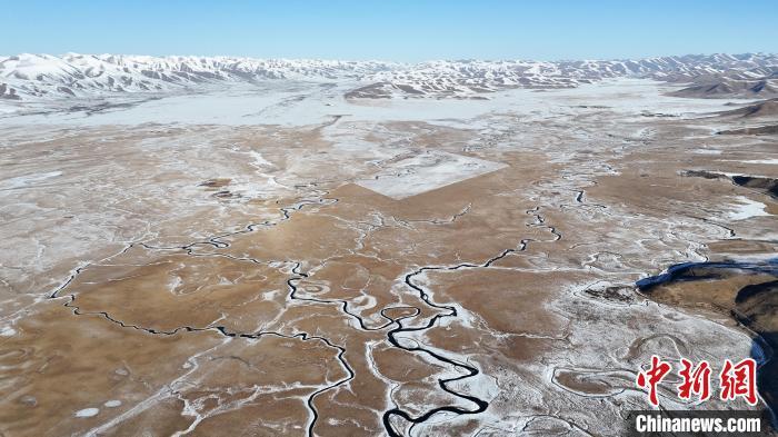 圖為雪后的瑪曲縣阿萬倉濕地,河流逶迤蜿蜒似長龍。(無人機照片)中新社記者 九美旦增 攝
