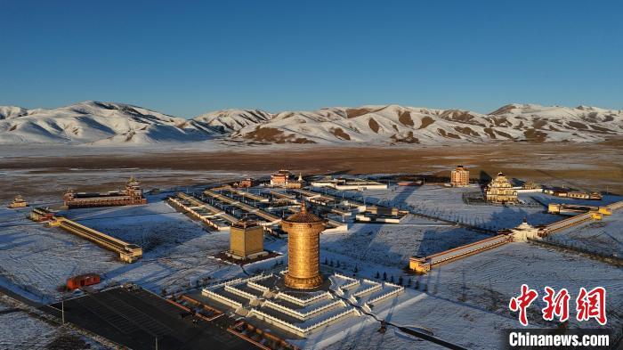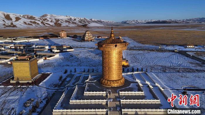 圖為阿萬倉鎮寧瑪寺大經筒與周圍的白雪形成了鮮明的對比。(無人機照片)中新社記者 九美旦增 攝