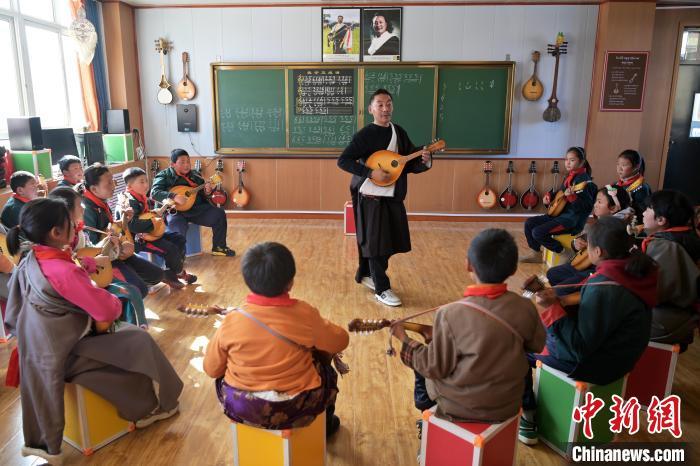 2月26日,甘肅省甘南藏族自治州瑪曲縣寄宿制藏族小學(xué)龍頭琴彈唱社團活動,加措正在教孩子們彈唱。九美旦增 攝