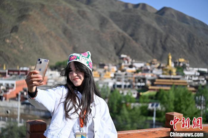 6月10日,甘肅甘南藏族自治州夏河縣,迪拜中阿衛(wèi)視主持人阿斯瑪在參觀拉卜楞寺景區(qū)時(shí)自拍留念。中新社記者 九美旦增 攝