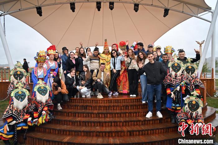 6月9日,甘肅甘南藏族自治州夏河縣,中外嘉賓與當(dāng)?shù)孛褡逦璧副硌菡吆嫌傲裟睢V行律缬浾?九美旦增 攝