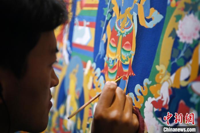 6月10日,甘肅甘南藏族自治州夏河縣,唐卡畫師正在畫唐卡。中新社記者 九美旦增 攝