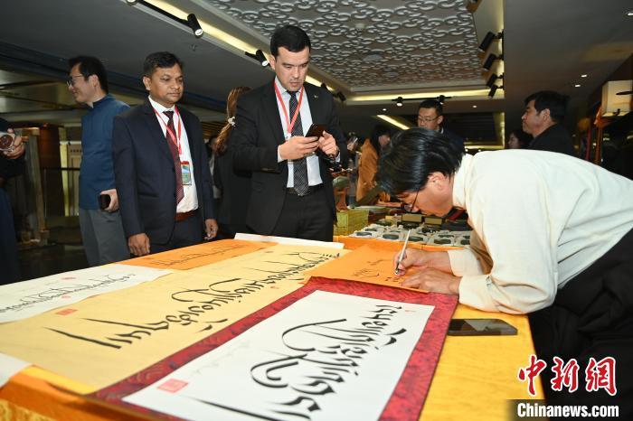 6月10日,甘肅甘南藏族自治州合作市,2025甘南文旅全球媒體發(fā)布會(huì)現(xiàn)場(chǎng)的藏文書法吸引中外嘉賓。中新社記者 九美旦增 攝