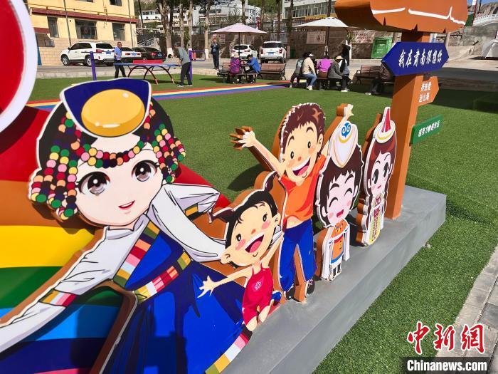 裕興社區,是祁連山腳下甘肅張掖市肅南裕固族自治縣打造的“互嵌式社區樣板”。圖為社區內放置的民族團結標識。楊艷敏 攝