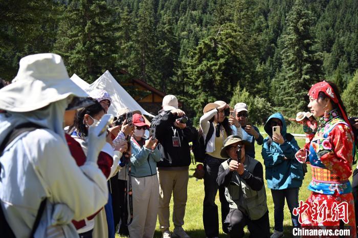 圖為采訪團成員拍攝“三格毛”民族服飾和巴郎鼓舞表演。九美旦增 攝