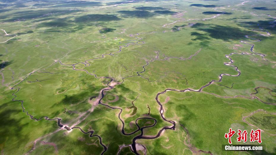 7月12日,瑪曲縣阿萬倉濕地風景如畫。(無人機照片)中新社記者 九美旦增 攝