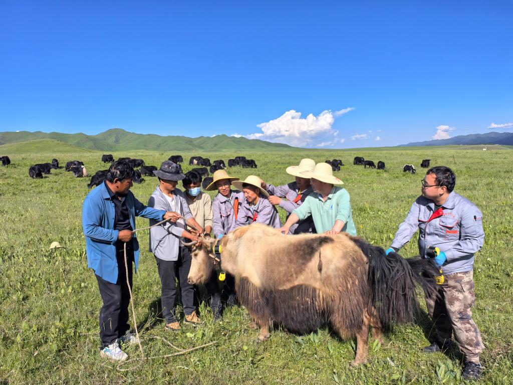 邱山桐(右二)正在檢查牦牛狀況。(2024年7月攝)(受訪者供圖)
