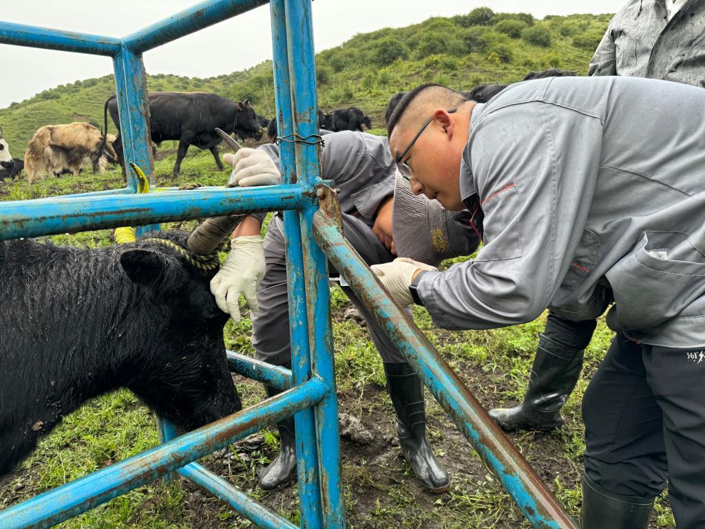 潘陽陽正在檢查牦牛狀況(2025年7月攝)。(受訪者供圖)