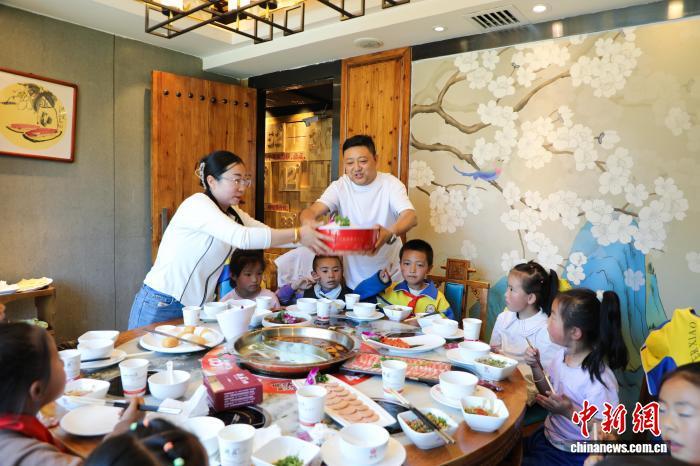 圖為2025年為慶祝“六一”國際兒童節,劉小成(中間白衣短袖)請甘南州合作市200位小朋友吃火鍋。(資料圖)受訪者供圖