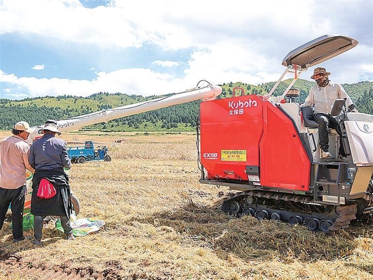 農(nóng)牧民使用機(jī)械收割農(nóng)作物。