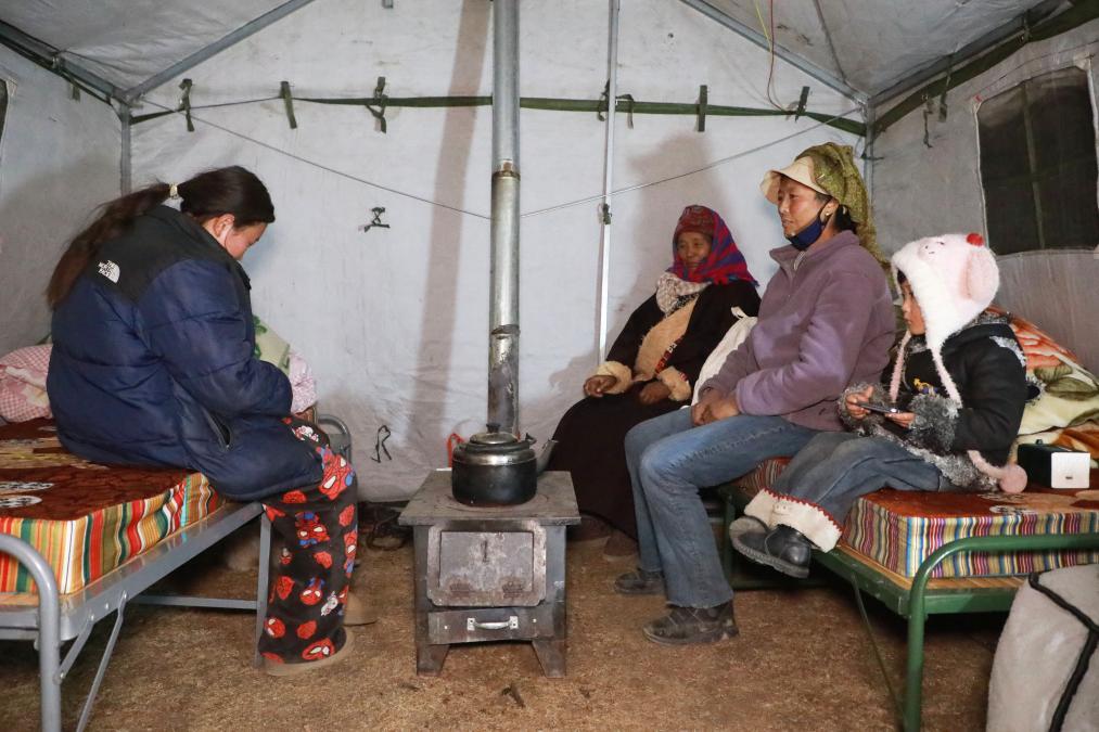 1月26日晚,在甘南州迭部縣電尕鎮哇曲村臨時安置點,群眾在應急帳篷內取暖休息。 新華社記者 張智敏 攝)