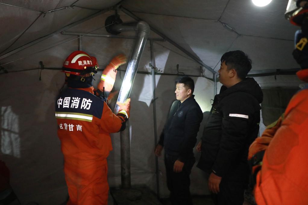 1月26日晚,在甘南州迭部縣電尕鎮哇曲村臨時安置點,消防救援人員在應急帳篷內幫助群眾安裝煤爐煙筒。 新華社記者 張智敏 攝