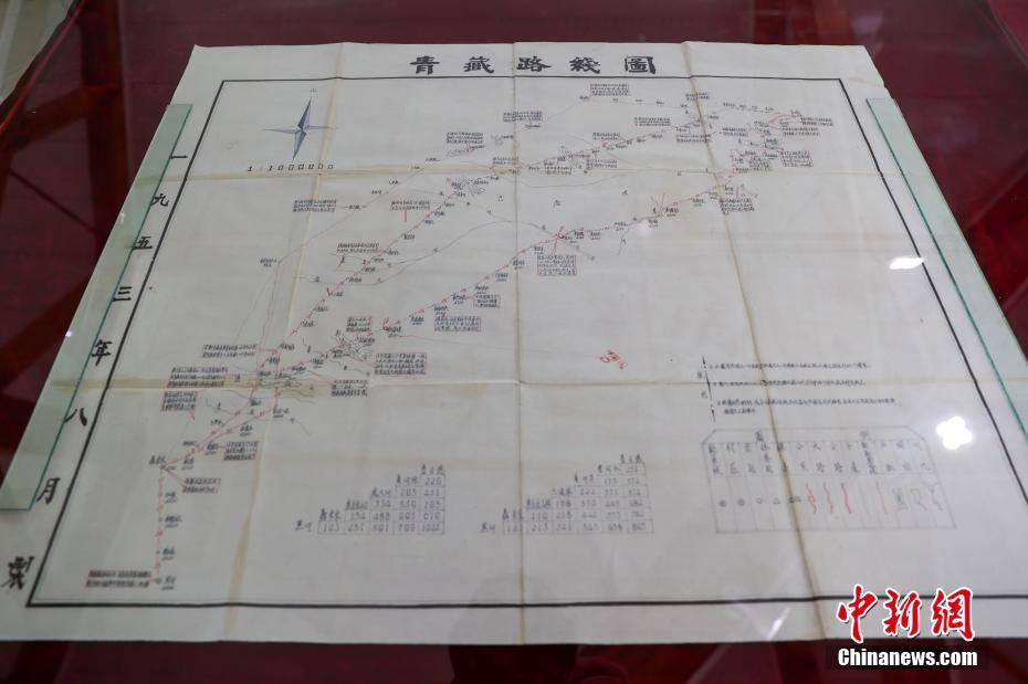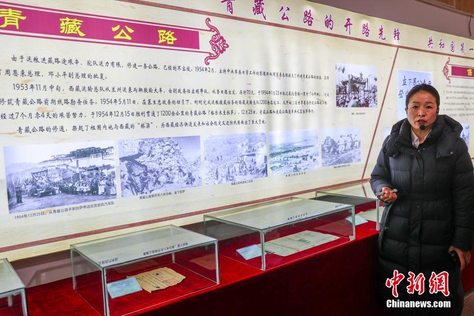 12月6日,在位于青海省海西蒙古族藏族自治州烏蘭縣茶卡鎮(zhèn)以南約18公里處的莫河駝場,陳列館擺放展覽的青藏路線圖。