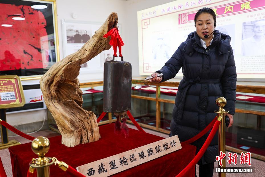 12月6日,在位于青海省海西蒙古族藏族自治州烏蘭縣茶卡鎮(zhèn)以南約18公里處的莫河駝場,工作人員講解西藏運輸總隊頭駝駝鈴。