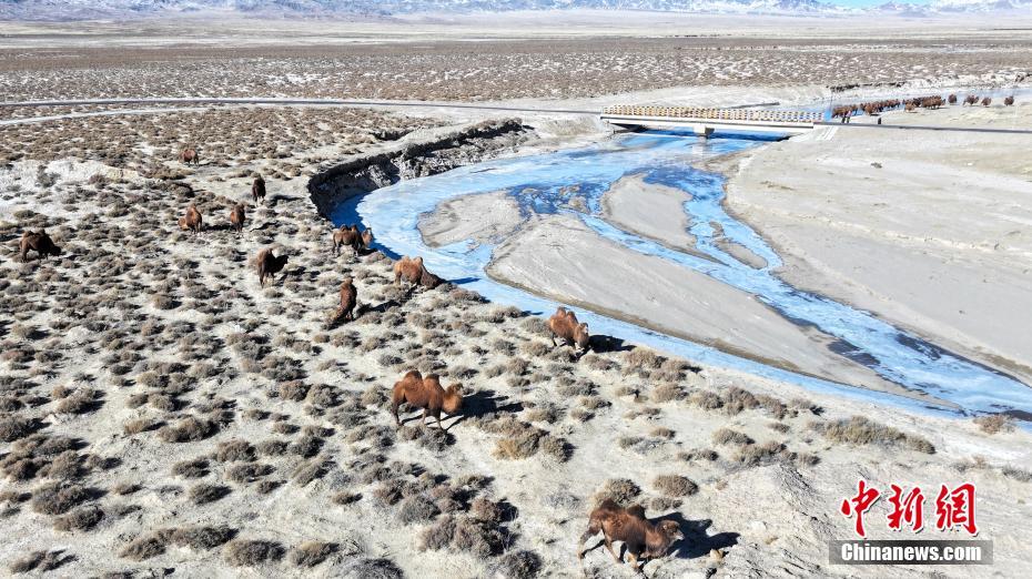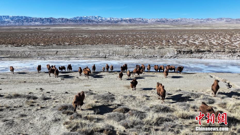 12月6日,在位于青海省海西蒙古族藏族自治州烏蘭縣茶卡鎮(zhèn)以南約18公里處的莫河駝場,駱駝在休息覓食。(無人機照片)