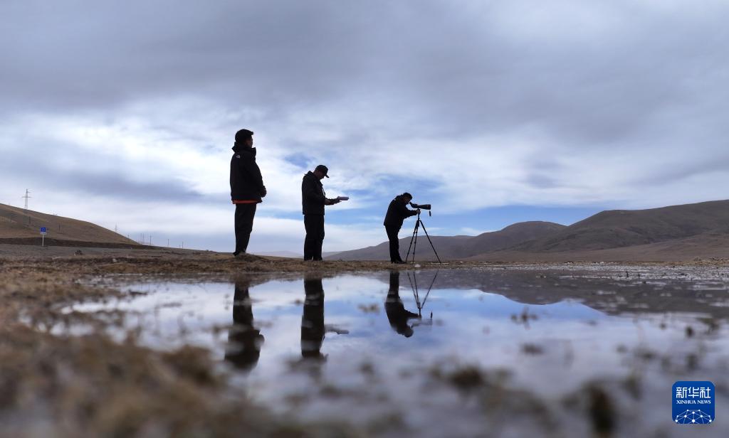 4月8日,青海隆寶國家級自然保護區(qū)生態(tài)管護員才仁多杰(右一)和同伴一起觀測候鳥(無人機照片)。新華社記者 張宏祥 攝