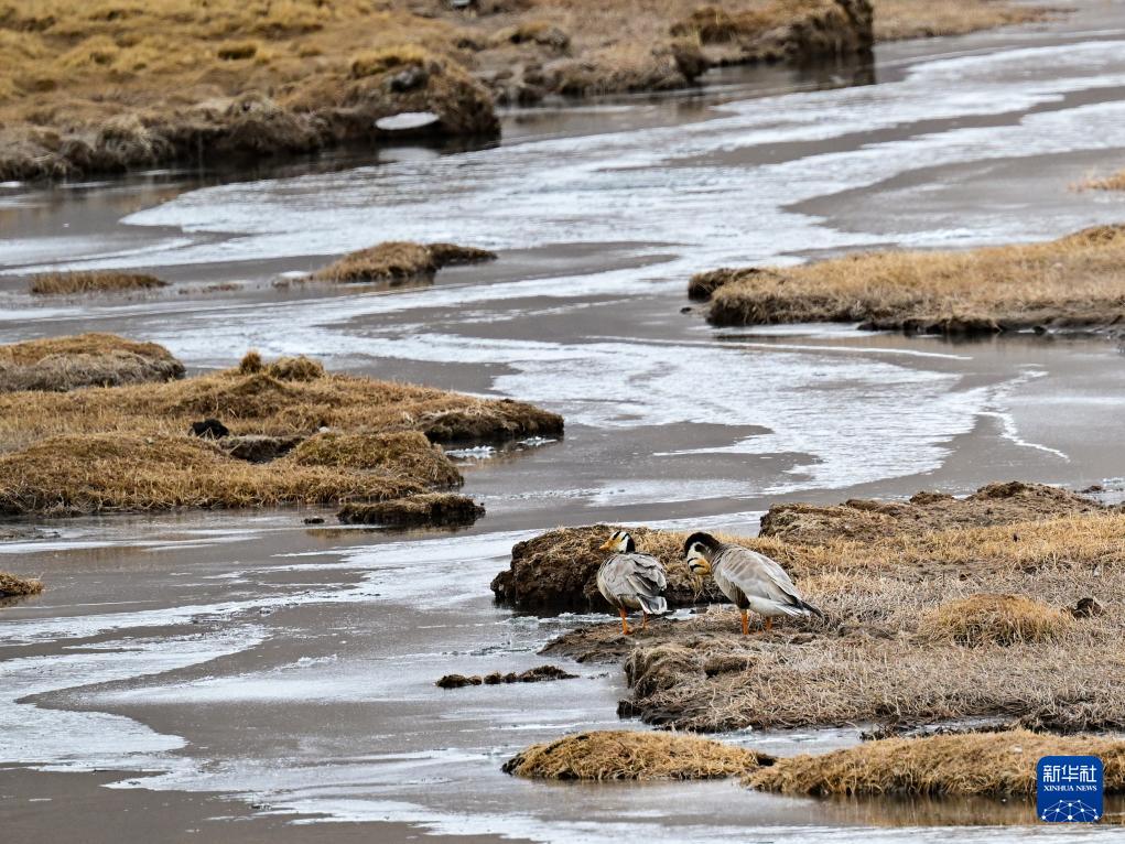 4月8日,兩只斑頭雁在青海隆寶國家級自然保護區(qū)內(nèi)活動。新華社記者 張龍 攝