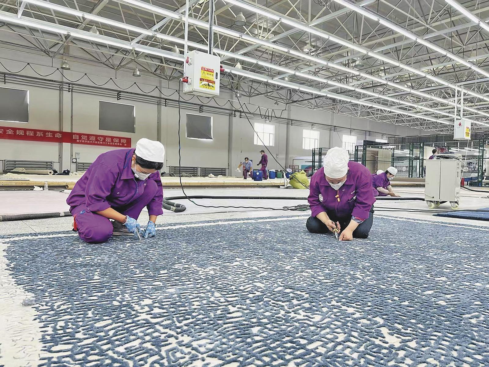 新型阿克明斯特機織與手工槍刺結合的生產線尤為亮眼。“這款產品80%機織打底、20%手工精修。”高文蘭指著正在運轉的生產線介紹,“不僅在價格上相較于純手工地毯更具優勢,還保留了80%的工藝質感,滿足市場對于高品質且價格合理產品的需求,去年這類產品總產量高達7.9萬平方米。”另外,槍刺產品產量去年達歷史最高,4.3萬平方米年產量中,有1.2萬平方米用于國外奢侈品店。