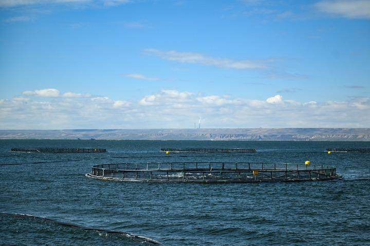 從空中俯瞰,龍羊峽水庫平湖區的水面上,數個大大的圓圈整齊排開,這些都是三文魚的養殖網箱。養殖網箱里,不時有魚兒躍起。順著管道,一條條三文魚隨著水流被吸魚泵直接從養殖網箱吸入操作車間。