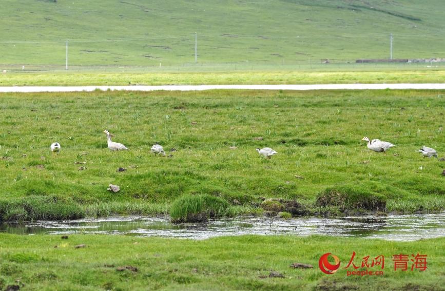 盛夏,斑頭雁在隆寶濕地覓食。人民網記者 甘海瓊攝